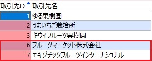 取引先管理テーブルには5つの会社名があり、そのうち赤枠の2つがまだフルーツ取引管理テーブルに載っていない状態です。