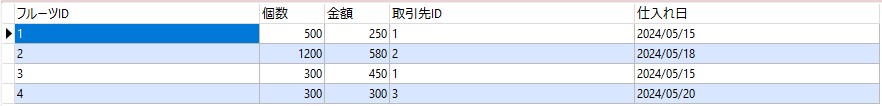 最後に、フルーツ取引管理テーブルを確認しましょう。このテーブルには複数の情報が含まれていますが、先ほど確認したフルーツIDと取引先IDも含まれています。
